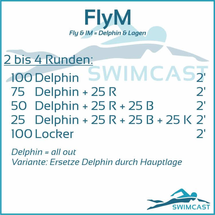 Ablauf: Geschwommen werden – je nach Leistungsniveau – 2 bis 4 Runden von 5x100m. Der 1. Hunderter sind 100m Delphin (ButterFLY) all out. Der 2. Hunderter sind dann nur noch 75m Delphin all out, gefolgt von 25m Rücken. Der 3. Hunderter besteht aus 50m Delphin all out, 25m Rücken, 25m Brust. Hunderter Nummer 4 sind dann 25m Delphin all out, 25m Rücken, 25m Brust und 25m Kraul (also 100m Lagen – im Englischen: IM). Und der letzte, der 5. Hunderter, sind 100m locker. Abgangszeit sind jeweils 2 Minuten.