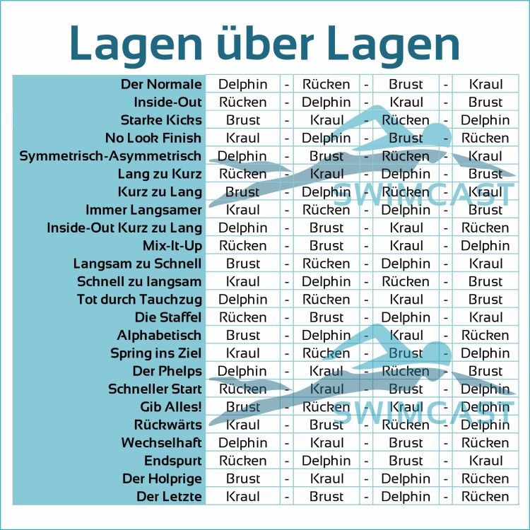 Ablauf: Bei insgesamt vier Schwimmarten (Delphin, Rücken, Brust und Kraul) gibt es ganze 24 Möglichkeiten, diese zu kombinieren. Dann mal los, egal ob die schnellen 24x50m, die soliden 24x100m, die gemeinen 24x200m oder die ehrenlosen 24x400m.