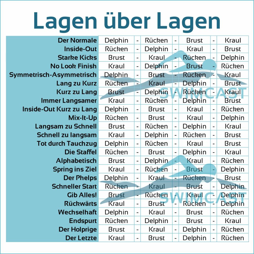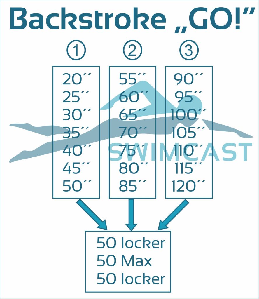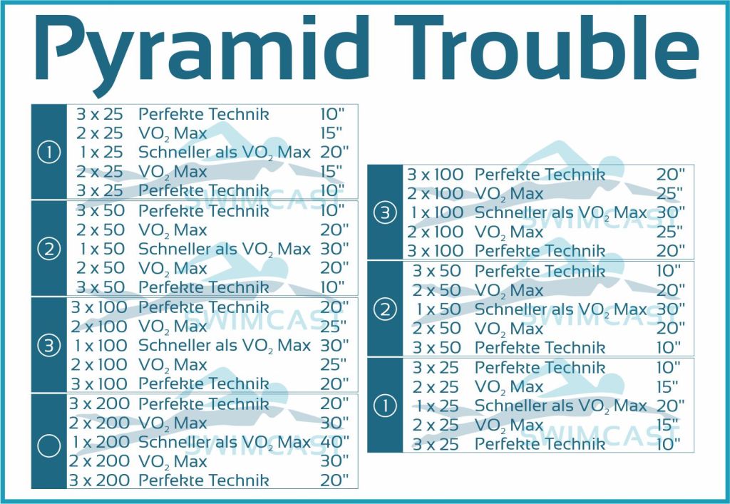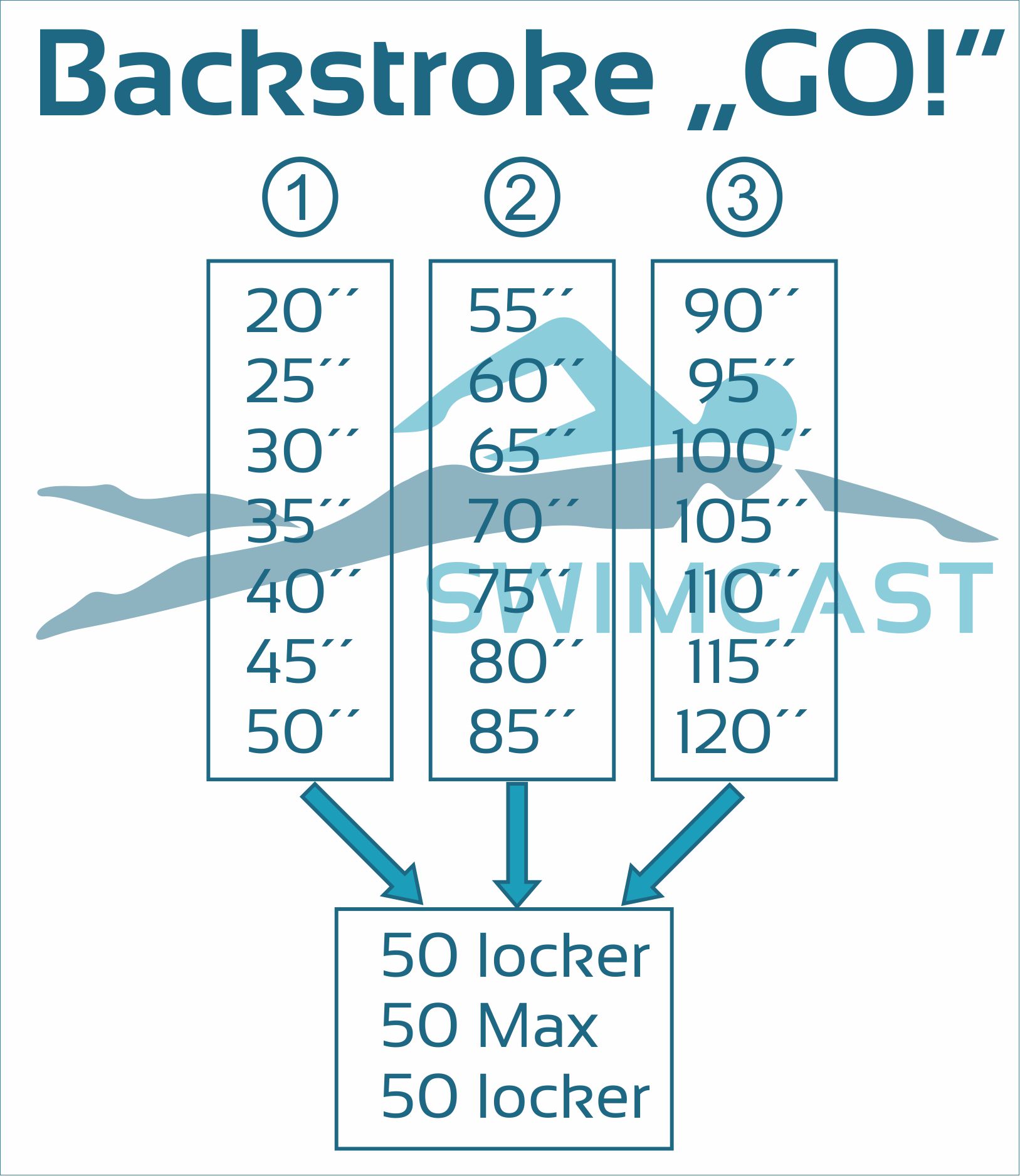 In 21 Etappen wird die Abgangszeit von 20 Sekunden auf 120 Sekunden gesteigert. Die Sportler sollen jeweils so bald wie mรถglich eine Bahn mehr schwimmen.
