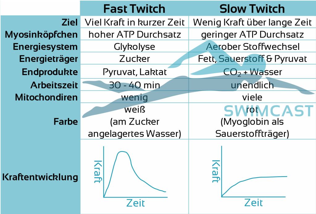 Grundsรคtzlich werden zwei Arten von Muskulatur unterschieden – fรผr uns im Schwimmsport am besten benannt als schnell kontrahierende (fast twitch) und langsam kontrahierende (slow twitch) Muskulatur. รrgerlicherweise unterscheiden sich die beiden Typen gar nicht in der Geschwindigkeit, in der sie kontrahieren, sondern in der Zeit, bis sie sich zusammenziehen. Das hรคngt mit ihrer Arbeitsweise zusammen.
