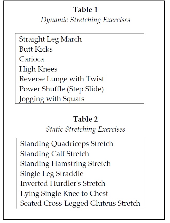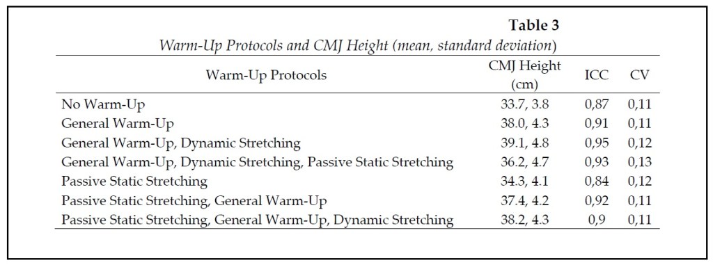 In aller Kürze: Allgemeines Warm-Up und allgemeines Warm-Up in Kombination mit dynamischem Stretching führten zur höchsten Sprungleistung (Counter Movement Jump).