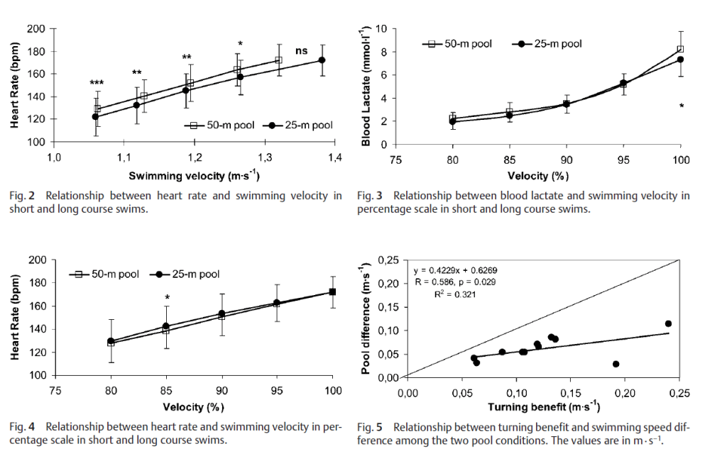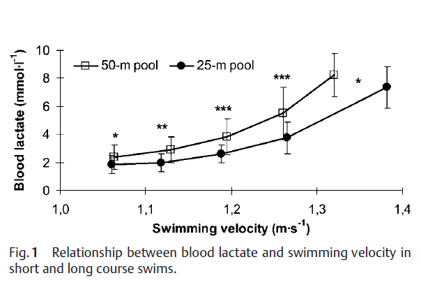 In aller Kürze: Gemessen an der maximalen Geschwindigkeit (Bestzeit) im 25 bzw 50m Becken unterscheiden sich die Laktatwerte bei submaximalem Tempo nicht. Erst bei maximalem Tempo (100% Bestzeit) gibt es Unterschiede. Bezügilch der Herzfrequenz gibt es keinen Unterschied über alle Geschwindigkeiten.