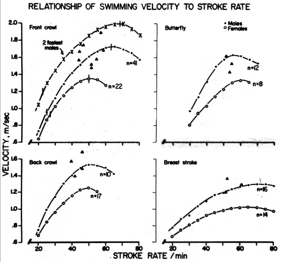 In aller Kürze: Generell wird die Schwimmgeschw. durch eine höhere Zugfrequenz realisiert. Die schnellsten RückenschwimmerInnen und KraulerInnen hatten die höchste Zuglänge (Distance per Stroke) bei niedrigen Geschwindigkeiten.
